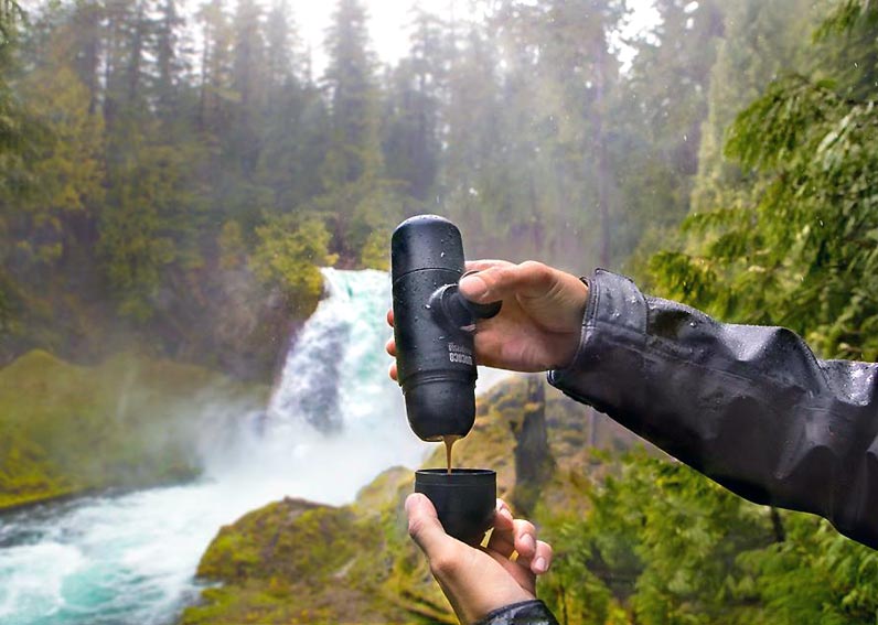 Устройство для приготовления кофе, которое можно взять с собой куда угодно. Для него не требуется электричество — только горячая вода и кофе. Залейте горячую воду в специальную емкость и засыпьте туда кофе, нагнетая давление помпой. 15 нажатий — кофе готов! Данный гаджет выпускается для молотого кофе и для капсул, так что вы можете выбрать наиболее подходящий вариант.