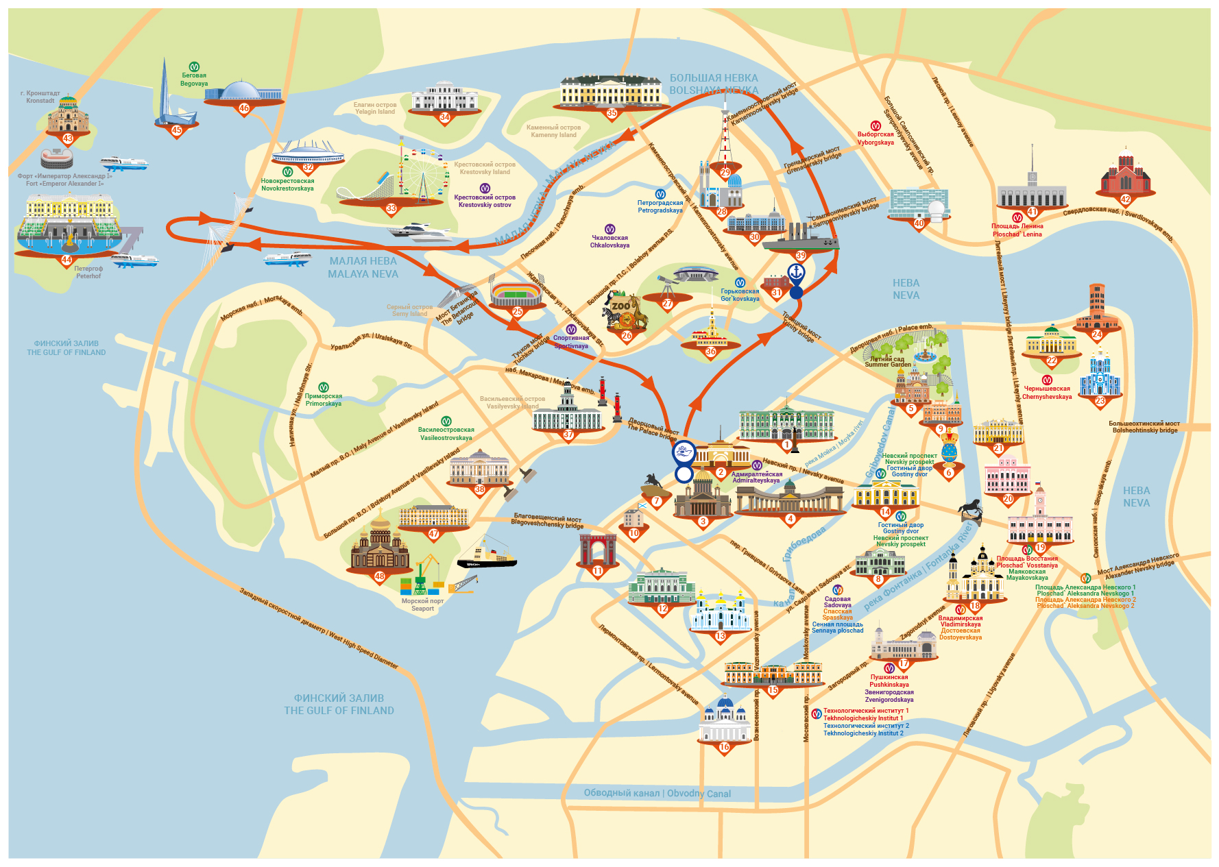 Также вы увидите Каменноостровский дворец, «Газпром Арену», Эрмитаж и Петропавловскую крепость.