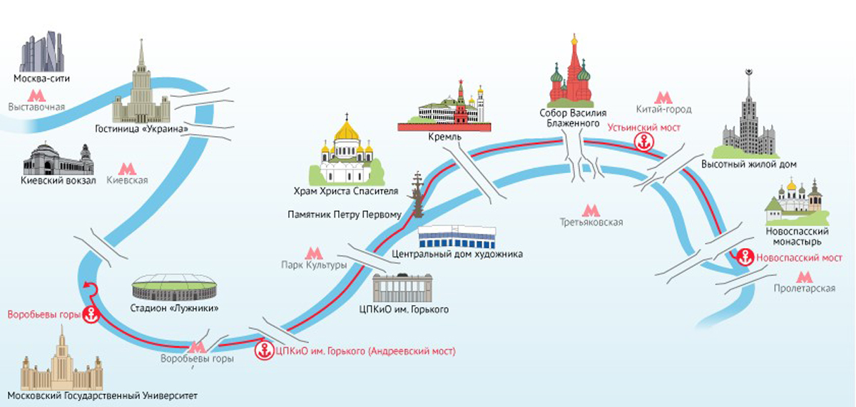 Наш теплоход сделает несколько остановок. Мы пришвартуемся у Киевского вокзала, возле Воробьёвых гор, парка Горького и вблизи Новоспасского моста.
